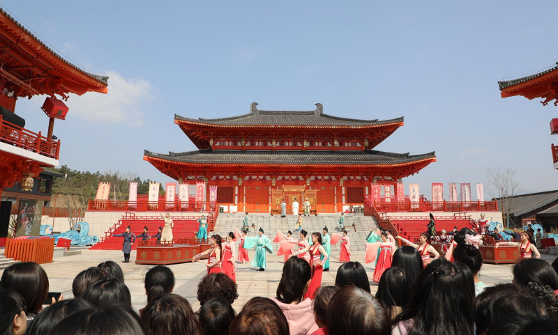 隨后,眾人在山頂休息片刻后,便一同下山前往大唐茶市觀看演出。古色古香的大唐茶市唐風(fēng)演藝小鎮(zhèn),一場(chǎng)大型沉浸式茶文化古風(fēng)演出正在上演,茶市街口人群涌動(dòng),商旅云集,《大唐茶市》表演將演出、展陳與地方特色商業(yè)業(yè)態(tài)巧妙融合在一起,大家紛紛都湊近距離認(rèn)真觀看。感受了一番浮梁人杰地靈的風(fēng)情特色和源遠(yuǎn)流長(zhǎng)的茶文化歷史。
