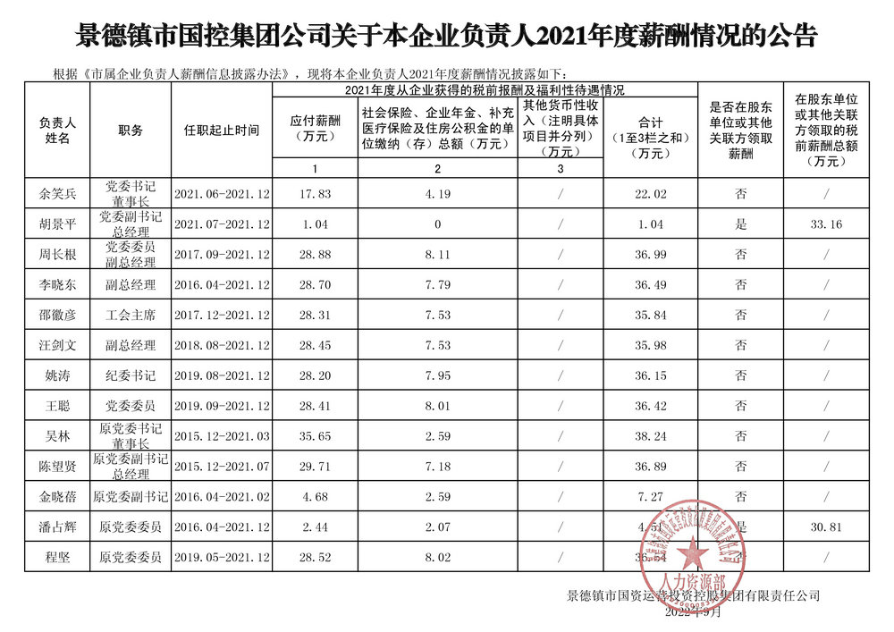 景德鎮(zhèn)市國控集團(tuán)公司關(guān)于本企業(yè)負(fù)責(zé)人2021年度薪酬情況的公告