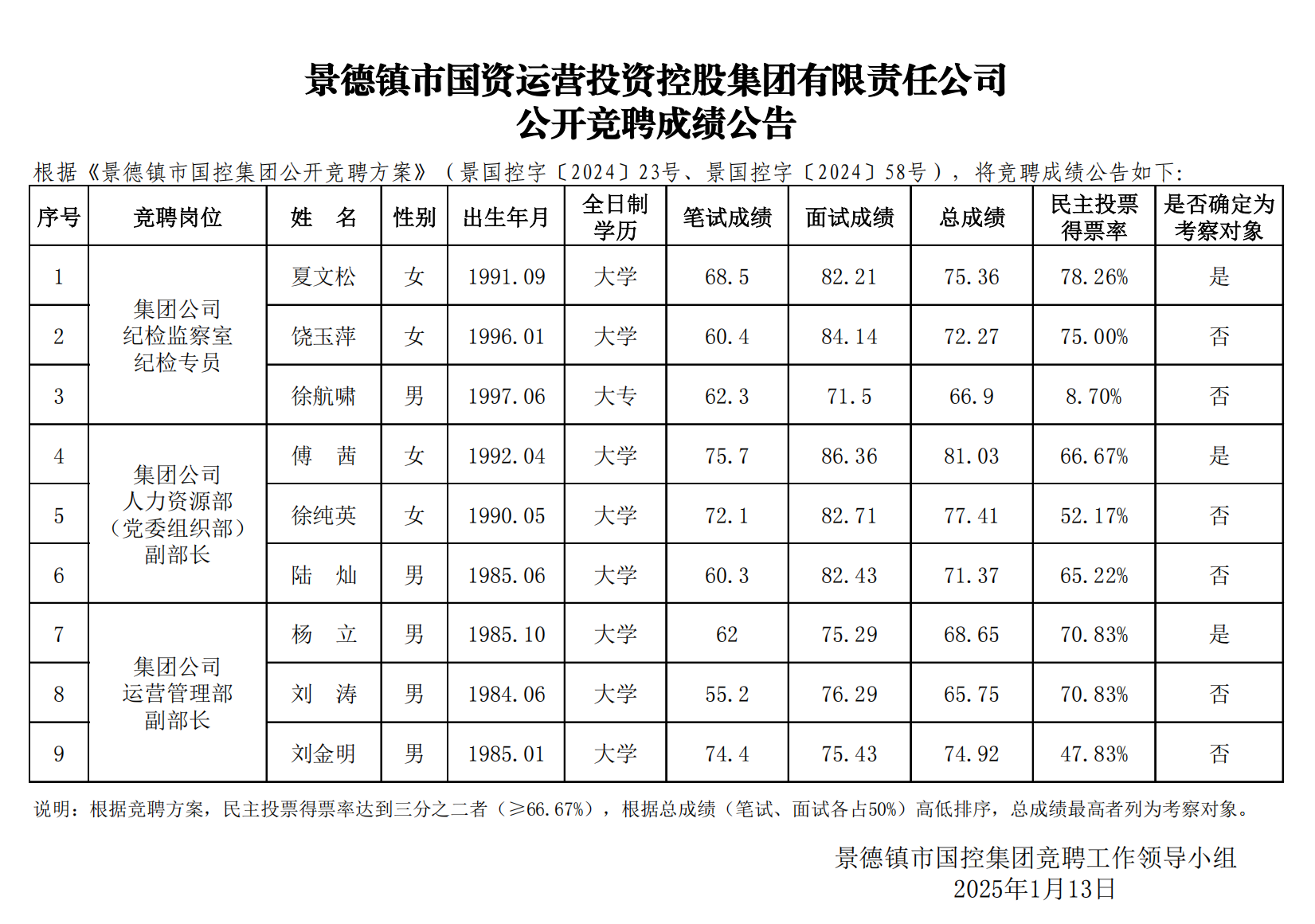 景德鎮(zhèn)市國資運(yùn)營投資控股集團(tuán)有限責(zé)任公司公開競(jìng)聘成績(jī)公告